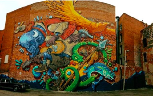 There’s no campfire here, but there is a story being told. Not in words, but in paint on an old brick wall; not unlike the tales told by brushstrokes in ancient caves, inviting us to gaze at the images until they seem to shimmer and move. Towering over us on this particular wall in downtown Cheyenne is that great-plains chieftain, the bison; above him the hawk, below him the fish, and winding around them, the snake. But, this isn’t an ordinary view of the Wyoming prairie, it’s a straight shot of visual adrenaline to your cerebral cortex. Our bison is plucking the strings of a guitar, his hat levitating off his head while he crosses this brick stage like a Western Chuck Berry. What’s he playing? What do you hear? The trembling, plaintive wail of a B.B. King solo? The gritty, whisky-soaked acoustic twang of a Delta blues classic? Maybe the lonely-road melody of a timeless country ballad. Do you feel the wind moving underneath the hawk’s wings as he rides the thermals, or the warmth of the setting sun as it falls out of the sky behind those shadow-blue peaks?